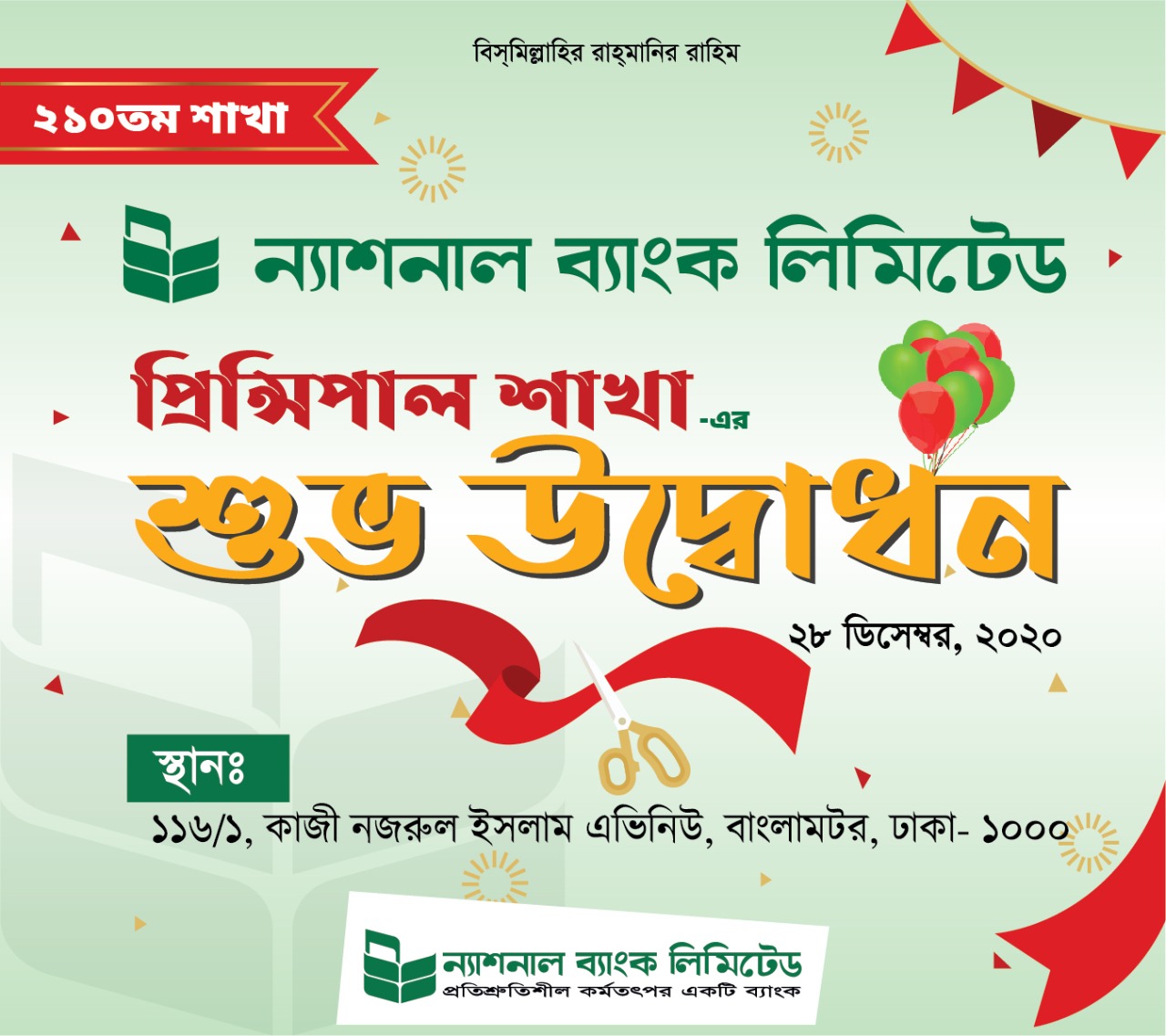 NATIONAL BANK LIMITED 210th BRANCH PRINCIPAL BRANCH GOING TO BE OPEN ON 28th DECEMBER 2020.