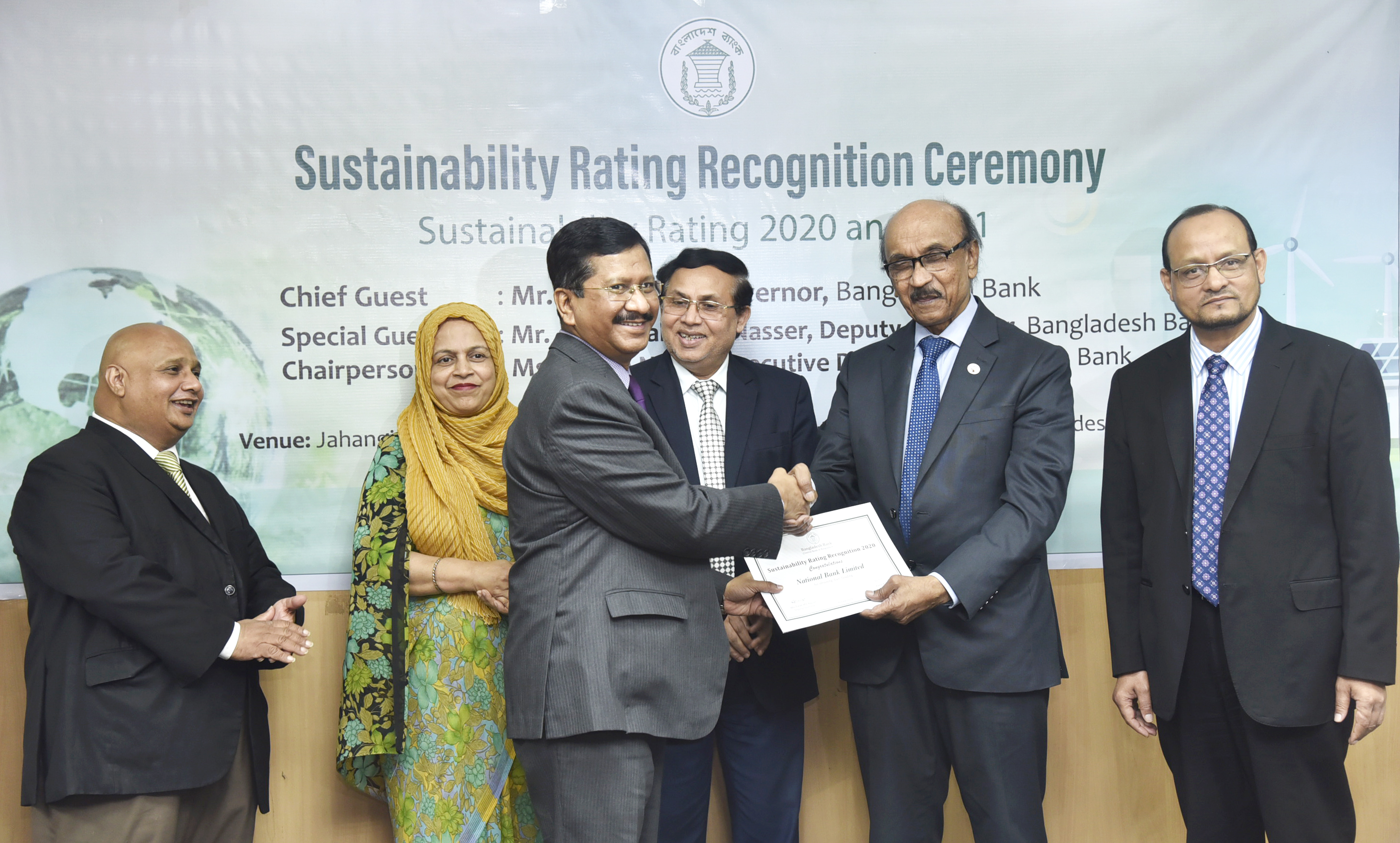 ন্যাশনাল ব্যাংক লিমিটেড এর ব্যবস্থাপনা পরিচালক ও সিইও মোঃ মেহমুদ হোসেন, ৩০ জুন ২০২২ তারিখে বাংলাদেশ ব্যাংকের গভর্নর জনাব ফজলে কবির এর নিকট হতে টেকসই ফেয়ার ব্যাংক হিসেবে "সাসটেইনেবিলিটি রেটিং রিকগনিশন ২০২০" সার্টিফিকেট গ্রহন করেছেন। টেকসই অর্থায়ন, সামাজিক দায়বদ্ধতামূলক কার্যক্রম, সবুজ প্রকল্পে অর্থায়ন ও টেকসই কোর ব্যাংকিং এই সূচকগুলোর উপর ভিত্তি করে সাসটেইনেবল রেটিং নির্ধারণ করা হয়। অনুষ্ঠানে বাংলাদেশ ব্যাংকের ডেপুটি গভর্নর জনাব এ কে এম সাজেদুর রহমান খান ও আবু ফরাহ মোঃ নাছের, নির্বাহী পরিচালক জনাব নুরুন নাহার এবং পরিচালক খোন্দকার মোরশেদ মিল্লাত উপস্থিত ছিলেন।